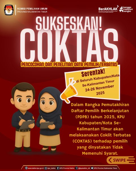 Samarindaa, kaltim.kpu.go.id - Pencocokan dan Penelitian Data Pemilih Terbatas akan dilaksanakan secara serentak di seluruh Kabupaten/Kota se-Kalimantan Timur pada tanggal 24–26 November 2025 . Kegiatan ini merupakan bagian penting dari Pemutakhiran Daftar Pemilih Berkelanjutan (PDPB) Tahun 2025, khususnya untuk memastikan kembali data pemilih yang sebelumnya dinyatakan Tidak Memenuhi Syarat (TMS). Dukungan masyarakat sangat penting agar daftar pemilih semakin akurat, pertukaran, dan berkualitas sebagai landasan pemilihan yang jujur dan berintegritas. Mari sukseskan bersama! ....