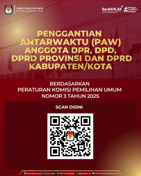 Samarinda, kaltim.kpu.go.id - PAW adalah proses penggantian anggota legislatif yang berhenti antarwaktu untuk digantikan oleh calon pengganti. Anggota Legislatif DPR, DPRD Provinsi, DPRD Kab/Kota : Proses penempatan Anggota yang berhenti antarwaktu, digantikan oleh calon pengganti yang diambil dari Daftar Calon Tetap (DCT) dari Partai Politik yang sama di daerah pemilihan yang sama yang mencakup peringkat suara terbanyak berikutnya. Anggota Legislatif DPD Proses penempatan Anggota DPD yang berhenti antarwaktu, digantikan oleh calon pengganti yang diambil dari DCT Anggota DPD pada daerah pemilihan provinsi yang sama yang menempati peringkat suara terbanyak berikutnya. Sebab Pemberhentian Antarwaktu (PAW) Anggota DPR, DPD, DPRD provinsi, atau anggota DPRD kabupaten/kotaberhenti antarwaktu karena tiga alasan utama : Meninggal dunia. Mengundurkan diri atas permintaan sendiri. Diberhentikan (Dapat disebabkan oleh Pindah Partai, Pelanggaran berat, dan lain-lain). Berikut adalah beberapa alasan spesifik anggota dapat dihentikan antarwaktu (Diberhentikan) sesuai tingkatan lembaga: Anggota DPR Dihentikan Antarwaktu Apabila: Tidak dapat menjalankan tugas secara berkelanjutan atau berhalangan tetap menjadi anggota DPR selama 3 bulan berturut-turut tanpa keterangan apa pun. Melanggar sumpah/janji jabatan dan kode etik DPR. Dinyatakan bersalah berdasarkan putusan pengadilan yang telah memperoleh kekuatan hukum tetap karena melakukan tindak pidana dengan ancaman pidana penjara 5 tahun atau lebih. Diusulkan oleh partai politiknya sesuai dengan ketentuan peraturan-undangan. Tidak lagi memenuhi syarat untuk menjadi calon anggota DPR. Melanggar ketentuan larangan yang diatur dalam Undang-Undang yang mengatur mengenai MPR, DPR, DPD, dan DPRD. Diberhentikan sebagai anggota partai politik. Menjadi anggota partai politik lain. Anggota DPD Dihentikan Antarwaktu Apabila: Tidak dapat menjalankan tugas secara berkelanjutan atau berhalangan tetap menjadi anggota DPD selama 3 bulan berturut-turut tanpa keterangan apa pun. Melanggar sumpah/janji jabatan dan kode etik DPD. Dinyatakan bersalah berdasarkan putusan pengadilan yang telah memperoleh kekuatan hukum tetap karena melakukan tindak pidana yang diancam dengan pidana penjara 5 tahun atau lebih. Tidak menghadiri sidang paripurna dan/atau rapat alat kelengkapan DPD sebanyak 6 kali berturut-turut tanpa alasan yang sah. Tidak memenuhi syarat untuk menjadi calon anggota DPD. Melanggar ketentuan larangan yang diatur dalam Undang-Undang yang mengatur mengenai MPR, DPR, DPD, dan DPRD. Anggota DPRD Provinsi Dihentikan Antarwaktu Apabila: Tidak dapat menjalankan tugas secara berkelanjutan atau berhalangan tetap selama 3 bulan berturut-turut tanpa keterangan apa pun. Melanggar sumpah/janji jabatan dan kode etik DPRD provinsi. Dinyatakan bersalah berdasarkan putusan pengadilan yang telah memperoleh kekuatan hukum tetap karena melakukan tindak pidana yang diancam dengan pidana penjara 5 tahun atau lebih. Tidak menghadiri rapat paripurna dan/atau rapat alat kelengkapan DPRD provinsi sebanyak 6 kali berturut-turut tanpa alasan yang sah. Diusulkan oleh partai politiknya. Tidak lagi memenuhi syarat sebagai calon anggota DPRD provinsi. Melanggar ketentuan larangan yang diatur dalam Undang-Undang tentang Pemerintahan Daerah. Diberhentikan sebagai anggota partai politik. Menjadi anggota partai politik lain. Anggota DPRD Kabupaten/Kota Dihentikan Antarwaktu Apabila: Tidak dapat menjalankan tugas secara berkelanjutan atau berhalangan tetap selama 3 bulan berturut-turut tanpa keterangan apa pun. Melanggar sumpah/janji jabatan dan kode etik DPRD kabupaten/kota. Dinyatakan bersalah berdasarkan putusan pengadilan yang telah memperoleh kekuatan hukum tetap karena melakukan tindak pidana dengan ancaman pidana penjara paling singkat 5 tahun. Tidak menghadiri rapat paripurna dan/atau rapat alat kelengkapan DPRD kabupaten/kota sebanyak 6 kali berturut-turut tanpa alasan yang sah39. Diusulkan oleh partai politiknya. Tidak lagi memenuhi syarat untuk menjadi calon anggota DPRD kabupaten/kota. Melanggar ketentuan larangan yang diatur dalam Undang-Undang tentang Pemerintahan Daerah. Diberhentikan sebagai anggota partai politik. Menjadi anggota partai politik lain. Anggota DPR, DPRD Provinsi, atau DPRD Kabupaten/Kota yang menjadi anggota partai politik lain masih memenuhi syarat Jika tidak dihentikan: Partai politik yang mencalonkan anggota tersebut tidak lagi menjadi peserta Pemilu atau kepengurusan partai politik tersebut sudah tidak ada lagi. Anggota tersebut tidak dihentikan atau ditarik kembali oleh Partai Politik yang mencalonkannya. Tidak lagi terdapat calon pengganti yang terdaftar dalam DCT dari partai yang mencalonkannya. Sumber PKPU Nomor 3 Tahun 2025 (unduh disini) ....