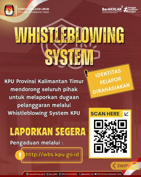 Samarinda, kaltim.kpu.go.id - Anda mengetahui dugaan tindak pidana korupsi dan/atau non tindak pidana korupsi yang telah atau akan dilakukan oleh seseorang yang Anda kenal tapi merasa sungkan atau takut identitasnya terungkap? Anda dapat melaporkan kepada Tim Kepatuhan Internal WBS, melalui aplikasi WBS. Tidak perlu takut identitas Anda akan terbongkar karena KPU akan menjamin identitas Anda. Melapor bukan mencari masalah tetapi bentuk keberanian menjaga integritas Jagan takut dan Jadilah #whisleblower bagi KPU! ....