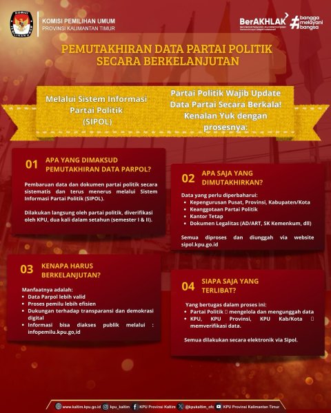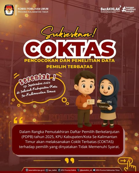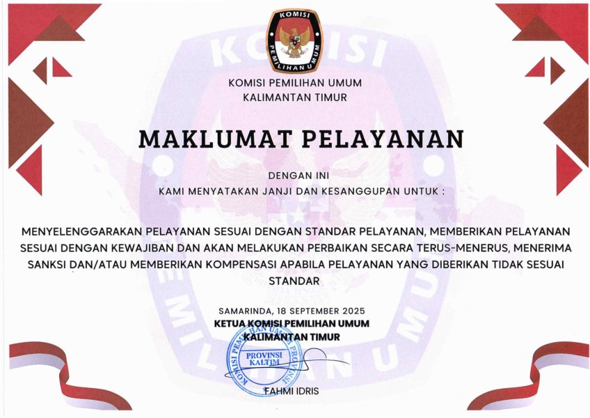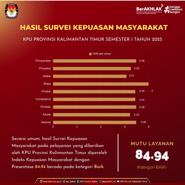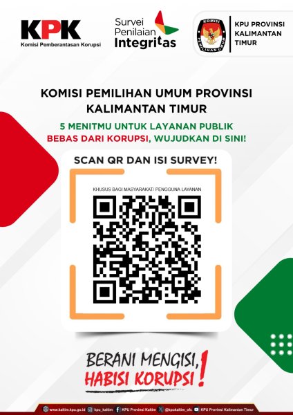 Kuesioner PEKPPP KPU Provinsi Kalimantan Timur Komisi Pemilihan Umum (KPU) Provinsi Kalimantan Timur terus berkomitmen untuk meningkatkan kualitas pelayanan publik yang transparan, akuntabel, dan berorientasi pada kebutuhan masyarakat. Sebagai bagian dari upaya tersebut, KPU Kaltim melaksanakan Pemantauan dan Evaluasi Kinerja Penyelenggaraan Pelayanan Publik (PEKPPP). Melalui kegiatan ini, KPU Kaltim ingin mengetahui sejauh mana pelayanan yang diberikan telah sesuai dengan harapan dan kebutuhan masyarakat. Oleh karena itu, kami mengajak partisipasi seluruh masyarakat untuk berkenan mengisi Kuesioner PEKPPP. Partisipasi Bapak/Ibu sangat penting karena: Menjadi bahan evaluasi bagi KPU Kaltim dalam memperbaiki layanan publik. Membantu mewujudkan pelayanan yang lebih cepat, tepat, dan responsif. Mendukung prinsip BerAKHLAK dan semangat #BanggaMelayaniBangsa. Silakan mengisi kuesioner melalui tautan berikut: ⇒ bit.ly/PEKPPPF-03A_KPUKALTIM Atau dengan memindai QR Code yang tersedia pada gambar di atas. Mari bersama-sama kita tingkatkan kualitas pelayanan publik di KPU Provinsi Kalimantan Timur demi tercapainya pemilu yang semakin transparan dan terpercaya.