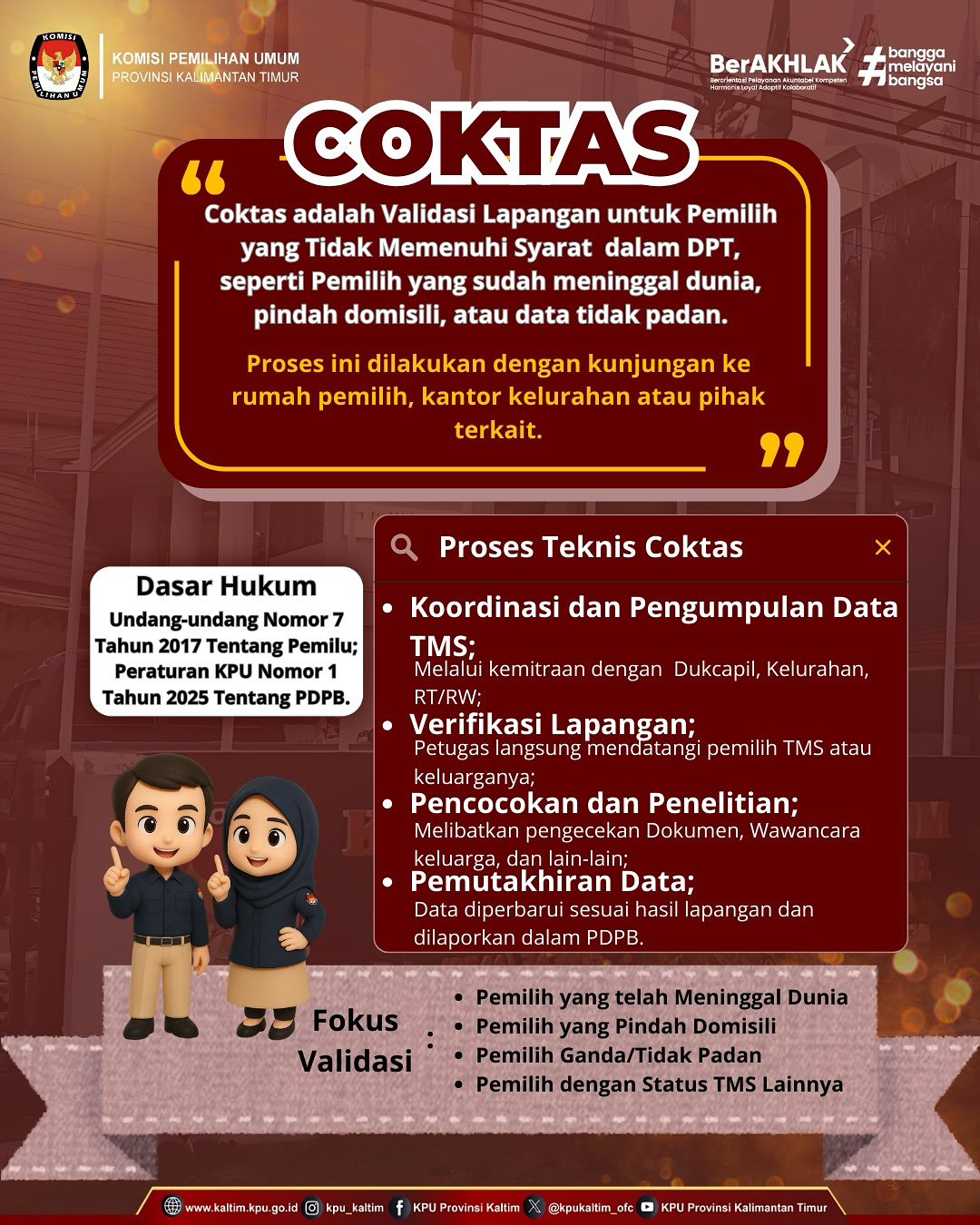 Samarinda, kaltim.kpu.go.id - KPU Provinsi Kalimantan Timur mengajak seluruh masyarakat untuk menyukseskan Coklit Terbatas (COKTAS) yang akan dilaksanakan secara serentak pada 09 September 2025 di seluruh Kabupaten/Kota se-Kalimantan Timur.