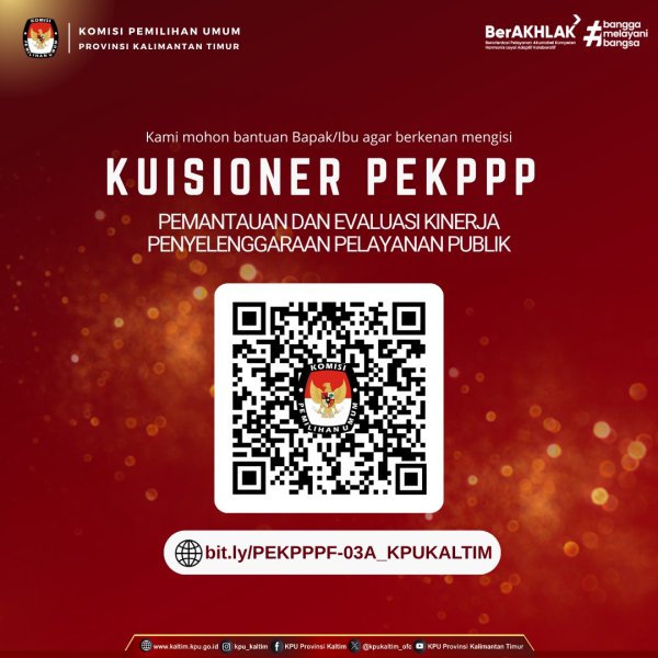 Melalui kegiatan ini, KPU Kaltim ingin mengetahui sejauh mana pelayanan yang diberikan telah sesuai dengan harapan dan kebutuhan masyarakat. Oleh karena itu, kami mengajak partisipasi seluruh masyarakat untuk berkenan mengisi Kuesioner PEKPPP.