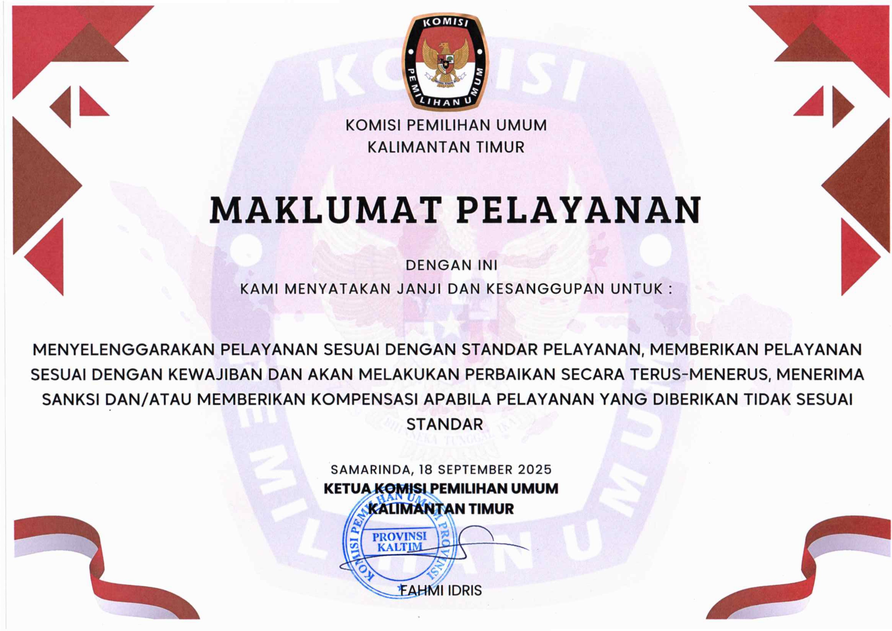 Maklumat Pelayanan KPU Provinsi Kalimantan Timur ditandatangani oleh Ketua KPU Provinsi Kalimantan Timur pada 18 September 2025 di Samarinda. Hal ini menunjukkan bahwa KPU Kaltim siap mempertanggungjawabkan setiap aspek pelayanan publik sesuai ketentuan perundang-undangan.
