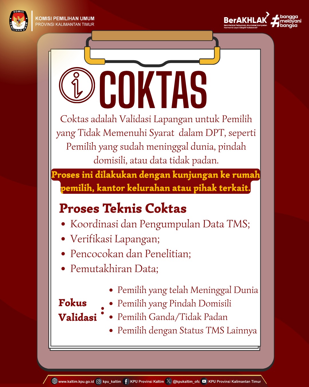 Samarindaa, kaltim.kpu.go.id - Pencocokan dan Penelitian Data Pemilih Terbatas akan dilaksanakan secara serentak di seluruh Kabupaten/Kota se-Kalimantan Timur pada tanggal 24–26 November 2025 .