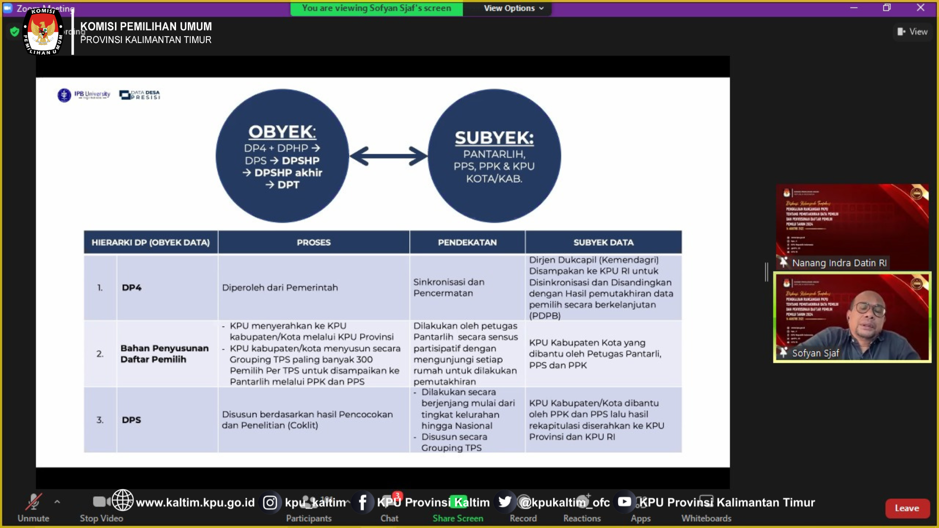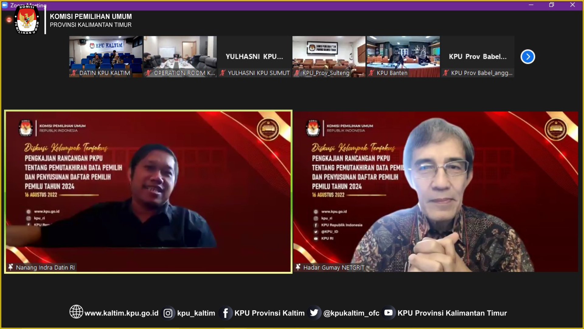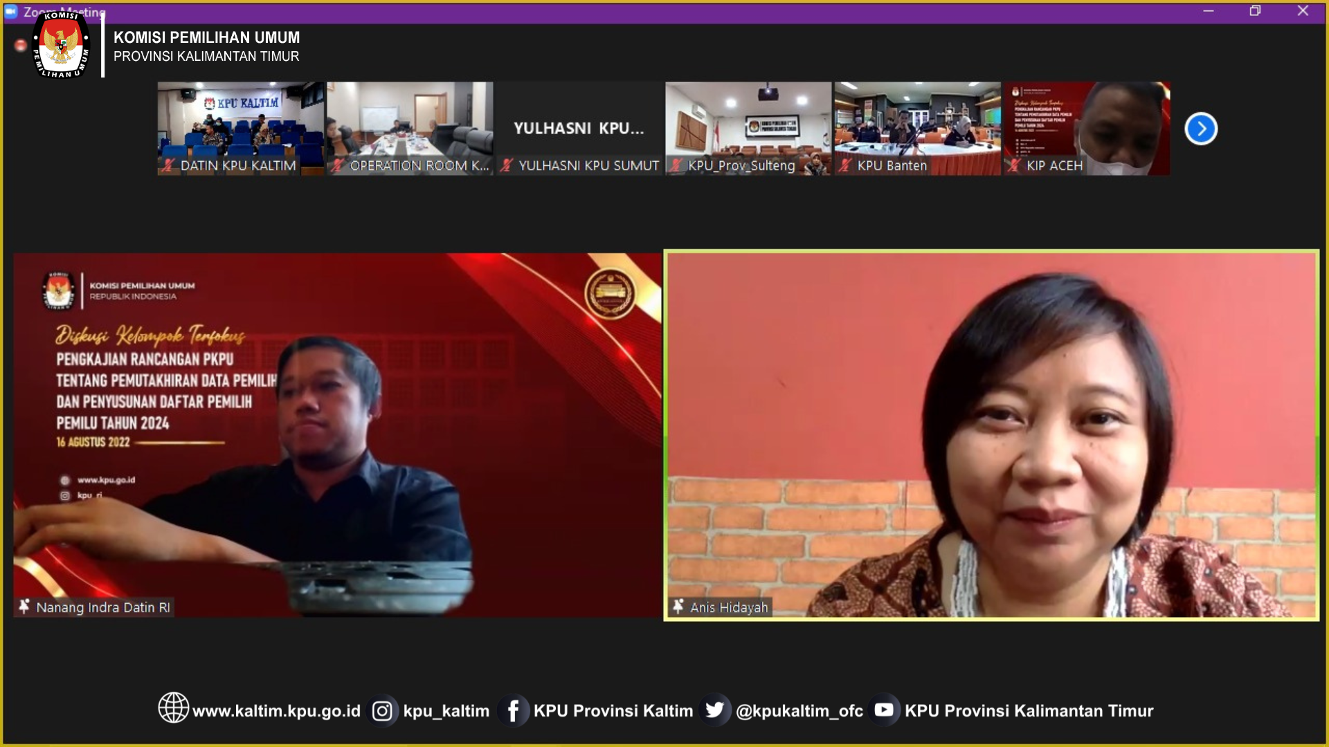Samarinda, kaltim.kpu.go.id - Ketua dan Anggota Divisi Perencanaan, Data dan Informasi KPU Provinsi Kalimantan Timur, Rudiansyah dan Iffa Rosita, didampingi Kepala Bagian, Kepala Subbagian beserta jajaran Subbagian Data dan Informasi Sekretariat KPU Provinsi Kalimantan Timur mengikuti kegiatan Diskusi Kelompok Terfokus Pengkajian Rancangan PKPU tentang Pemutakhiran Data Pemilih dan Penyusunan Daftar Pemilih Pemilu Tahun 2024 secara Daring melalui Zoom Meeting, Selasa (16/8/2022).