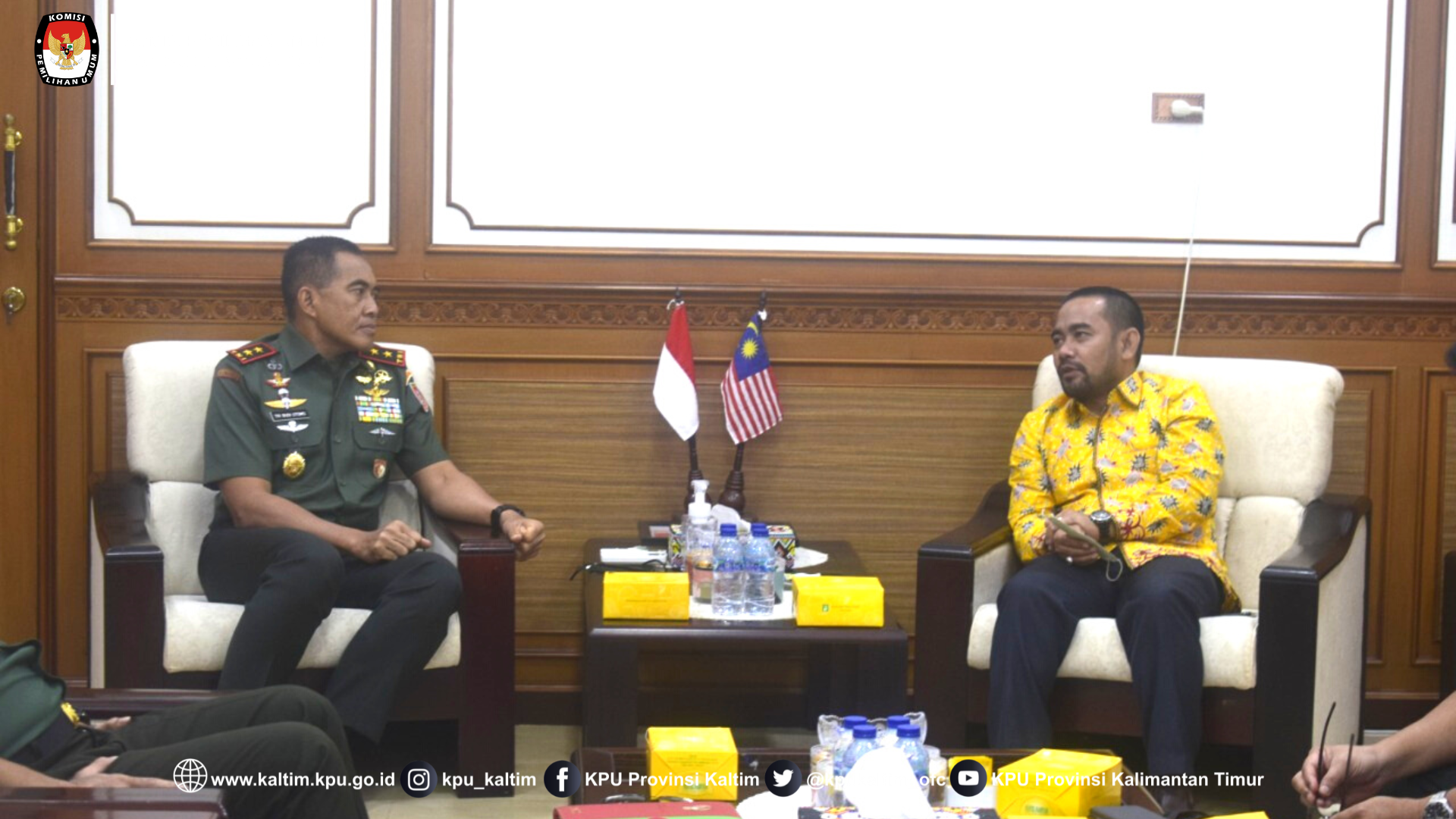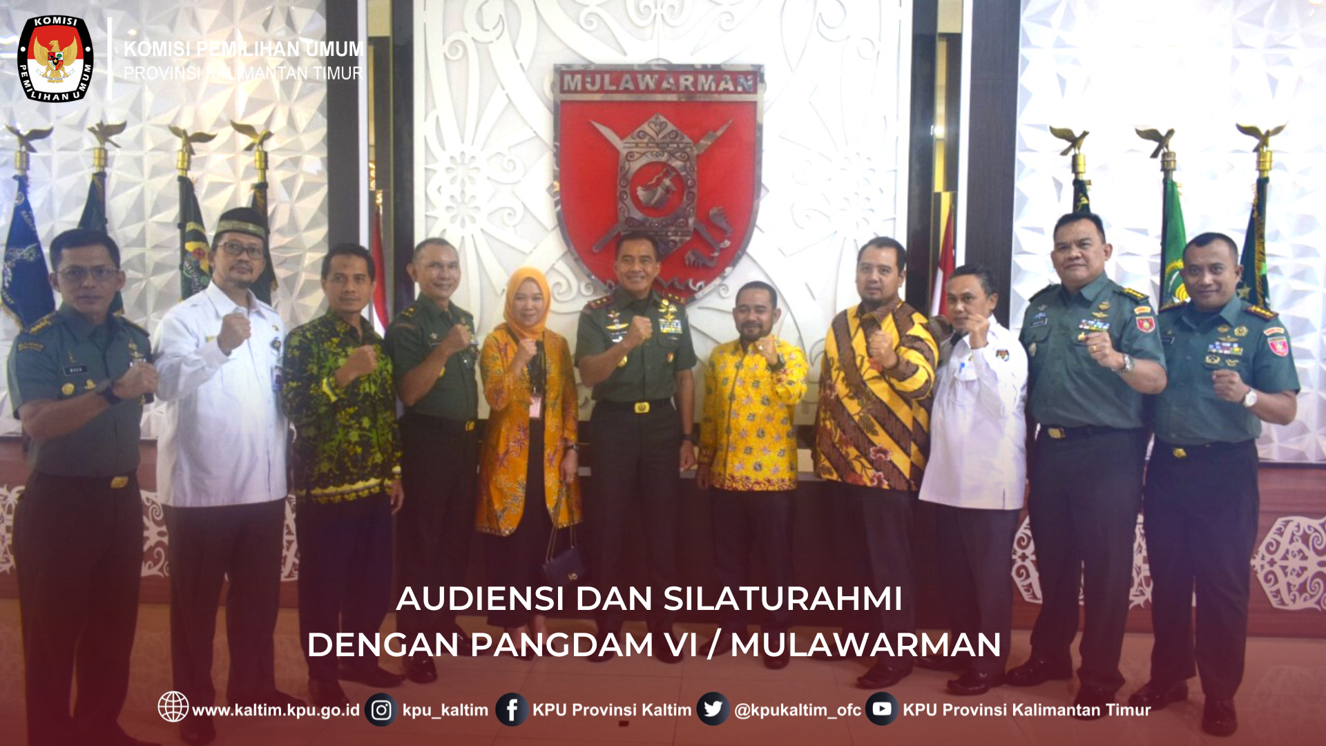 Bertempat di Ruang Yudha Makodam VI/Mulawarman, rombongan KPU Prov. Kaltim dipimpin Ketua Rudiansyah didampingi Anggota KPU Prov. Kaltim Iffa Rosita, Fahmi Idris, Mukhasan Ajib, Sekretaris KPU Prov. Kaltim H. Basir serta pejabat Sekretariat Kabag. Rendatin M. Zuhri dan Kabag. Keuangan, Umum dan Logistik Nurdiyawan, diterima oleh Panglima Kodam VI/Mulawarman, Mayjen TNI Tri Budi Utomo didampingi Kapoksahli Pangdam VI/Mlw, Pamen Ahli Bidang Ideologi dan Politik, Asintel Kasdam VI/Mlw, Asops Kasdam VI/Mlw, Aspers Kasdam VI/Mlw, Aster Kasdam VI/Mlw, dan Dandim 0905 Balikpapan.