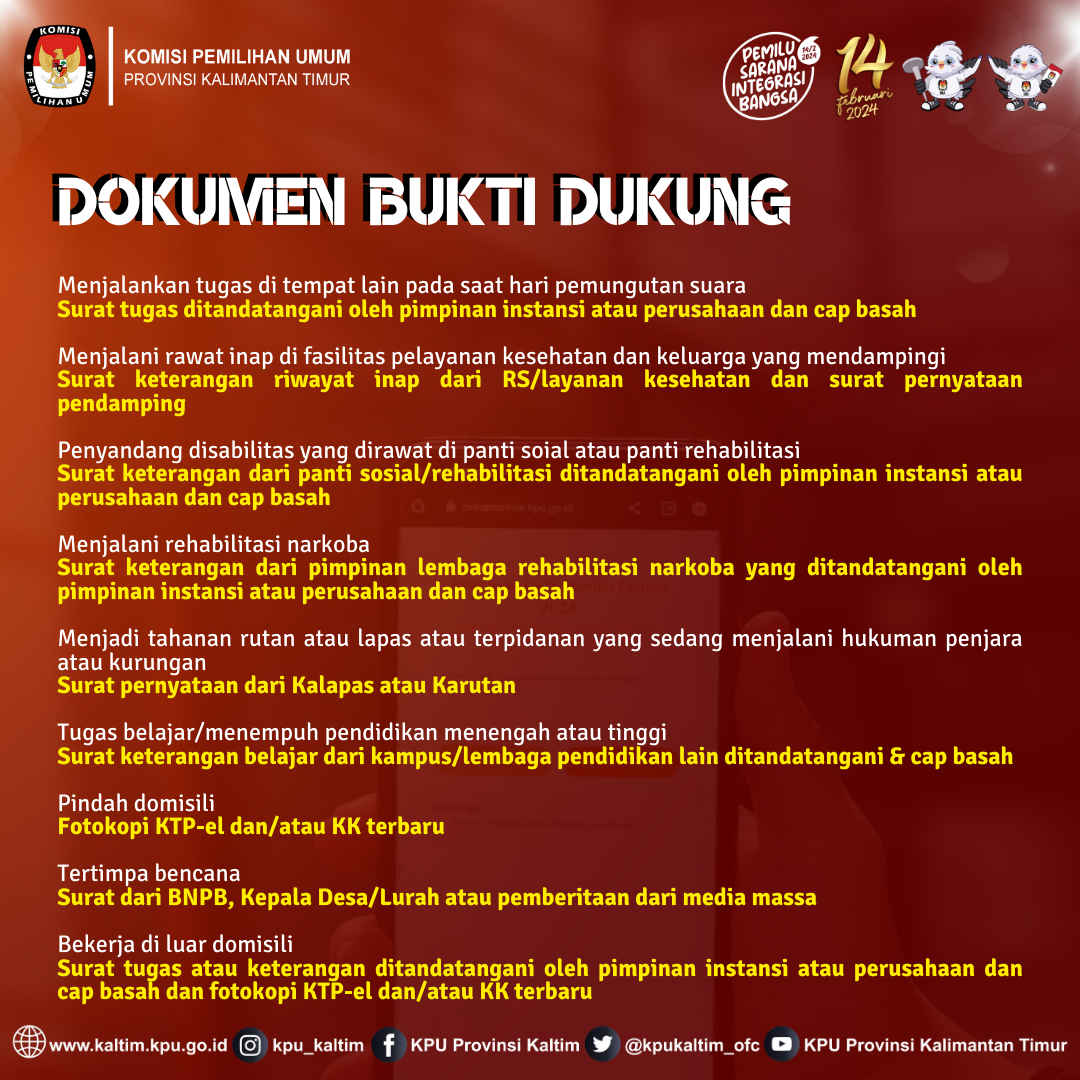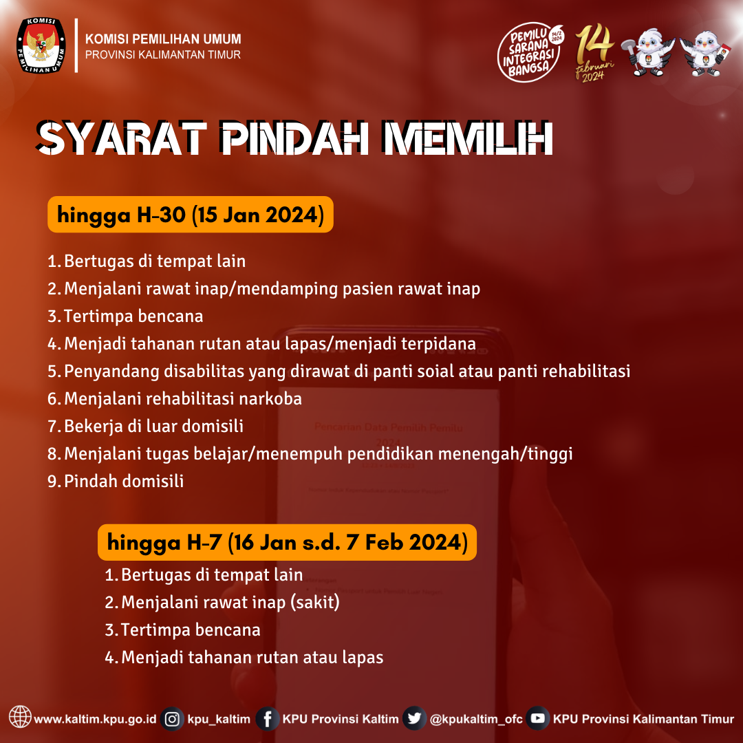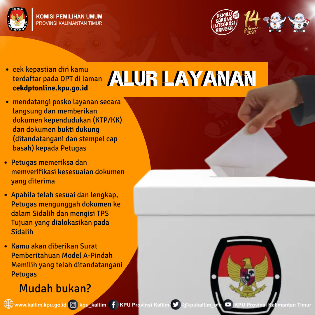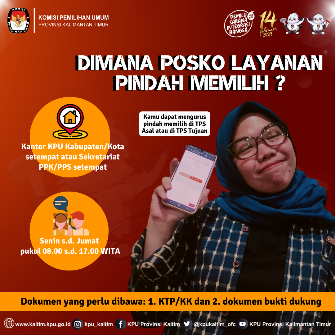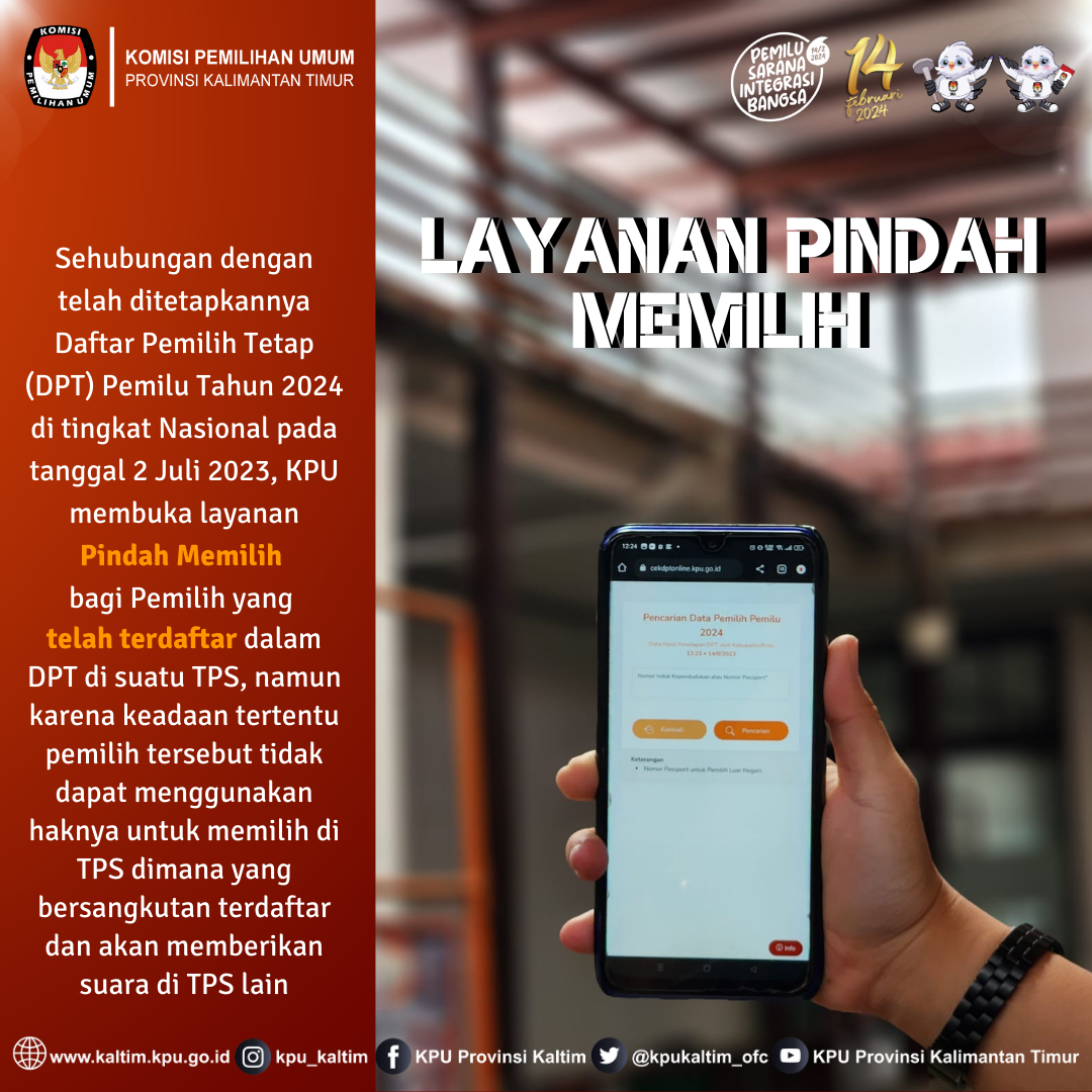 Samarinda, kaltim.kpu.go.id - KPU membuka layanan pindah memilih bagi Pemilih yang telah terdaftar dalam DPT Pemilu 2024 namun ingin memilih di TPS berbeda. Berikut info seputar layanan pindah memilih dicek yaaa! Jangan lupa bawa dokumen kependudukanmu (KTP/KK) dan dokumen data dukung sesuai alasan pindah memilihmu ke Petugas di posko layanan pindah memilih di kantor KPU Kabupaten/Kota atau kantor Sekretariat PPK/PPS wilayahmu masing-masing. (Tim Medsos KPU Kaltim)