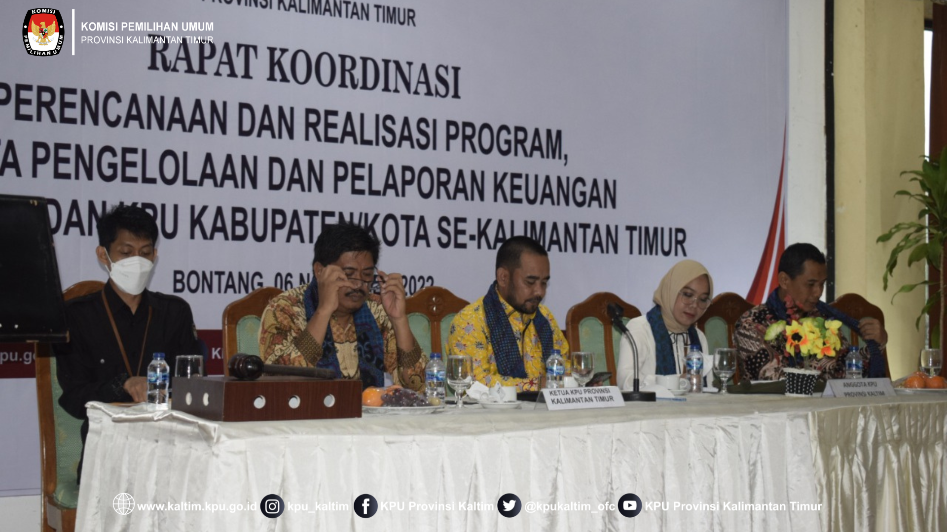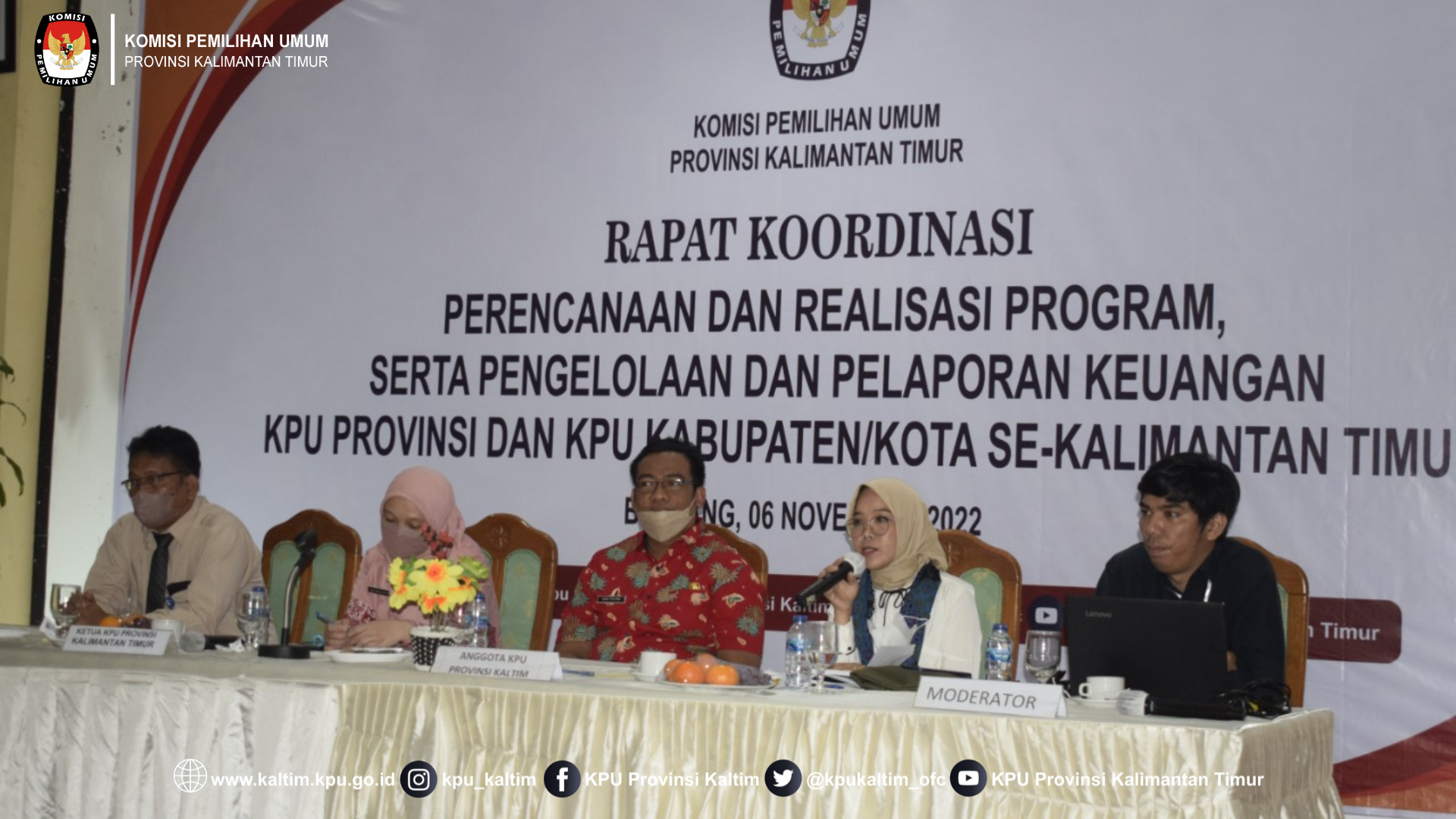 Bontang, kaltim.kpu.go.id - KPU Provinsi Kalimantan Timur melaksanakan Rapat Koordinasi Perencanaan dan Realisasi Program, serta Pengelolaan dan Pelaporan Keuangan KPU Provinsi dan KPU Kabupaten/Kota se Kalimantan Timur.