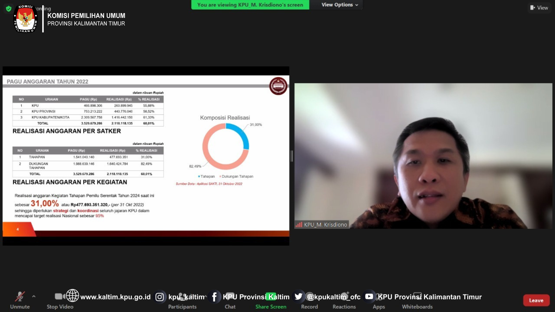 Kegiatan tersebut dilaksanakan di Hotel Bintang Sintuk Bontang pada Minggu (6/11/2022), Ketua KPU Kaltim Rudiansyah membuka sekaligus memberikan arahan terkait perencanaan, pengelolaan dan pertanggungjawaban anggaran di KPU Provinsi dan kabupaten/kota se Kaltim, yang dalam pelaporannya harus dilakukan dengan tertib administrasi, dengan harapan bisa mendapatkan predikat wajar tanpa pengecualian (WTP) saat audit BPK.