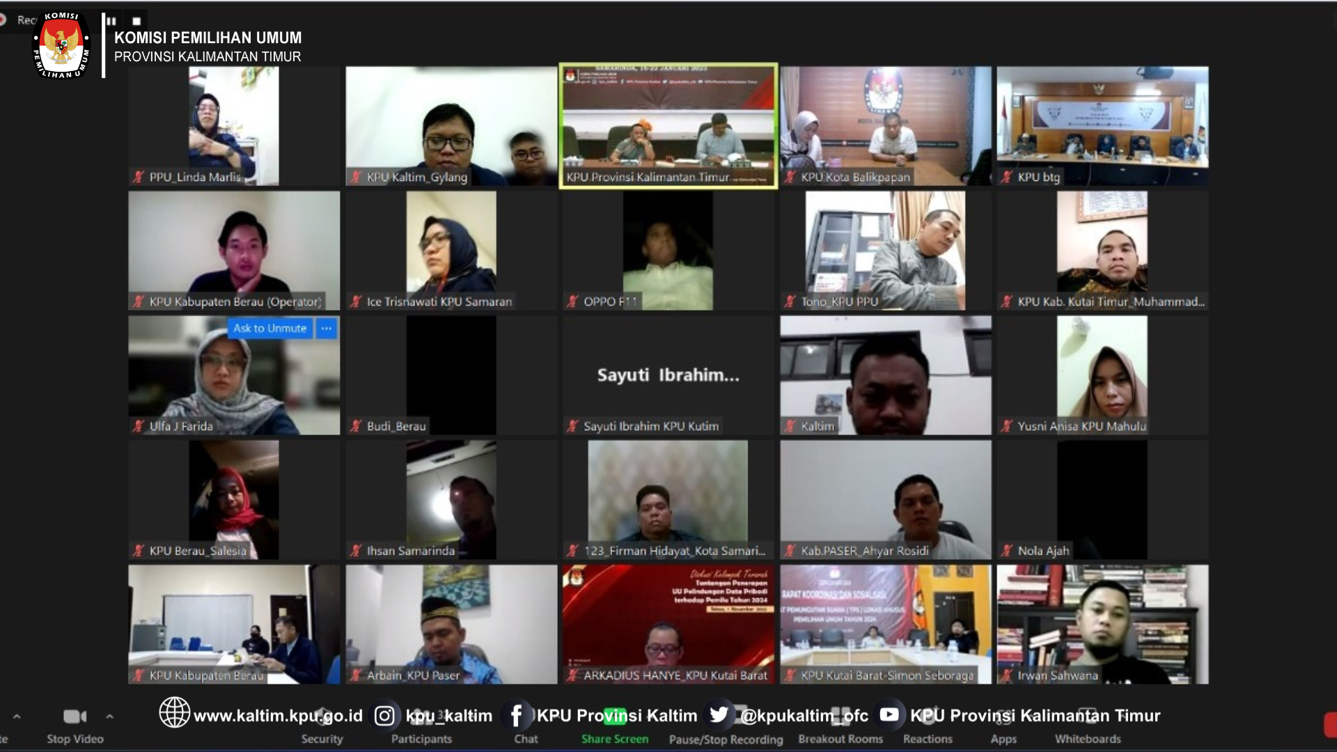 Samarinda, kaltim.kpu.go.id - KPU Provinsi Kalimantan Timur melaksanakan Rapat Koordinasi Persiapan Verifikasi Administrasi Perbaikan Kesatu Pencalonan Perseorangan Peserta Pemilihan Umum Bakal Calon Anggota Dewan Perwakilan Daerah (DPD) dengan KPU Kabupaten / Kota se Kalimantan Timur secara daring, (20/1/2023). Kegiatan ini mengundang Ketua, Divisi Teknis Penyelenggaraan KPU Kabupaten /Kota, Kasubbag Teknis Penyelenggara Pemilu dan Partisipasi Hubungan Masyarkat, serta admin silon KPU Kabuapten /Kota Se Kalimantan Timur.