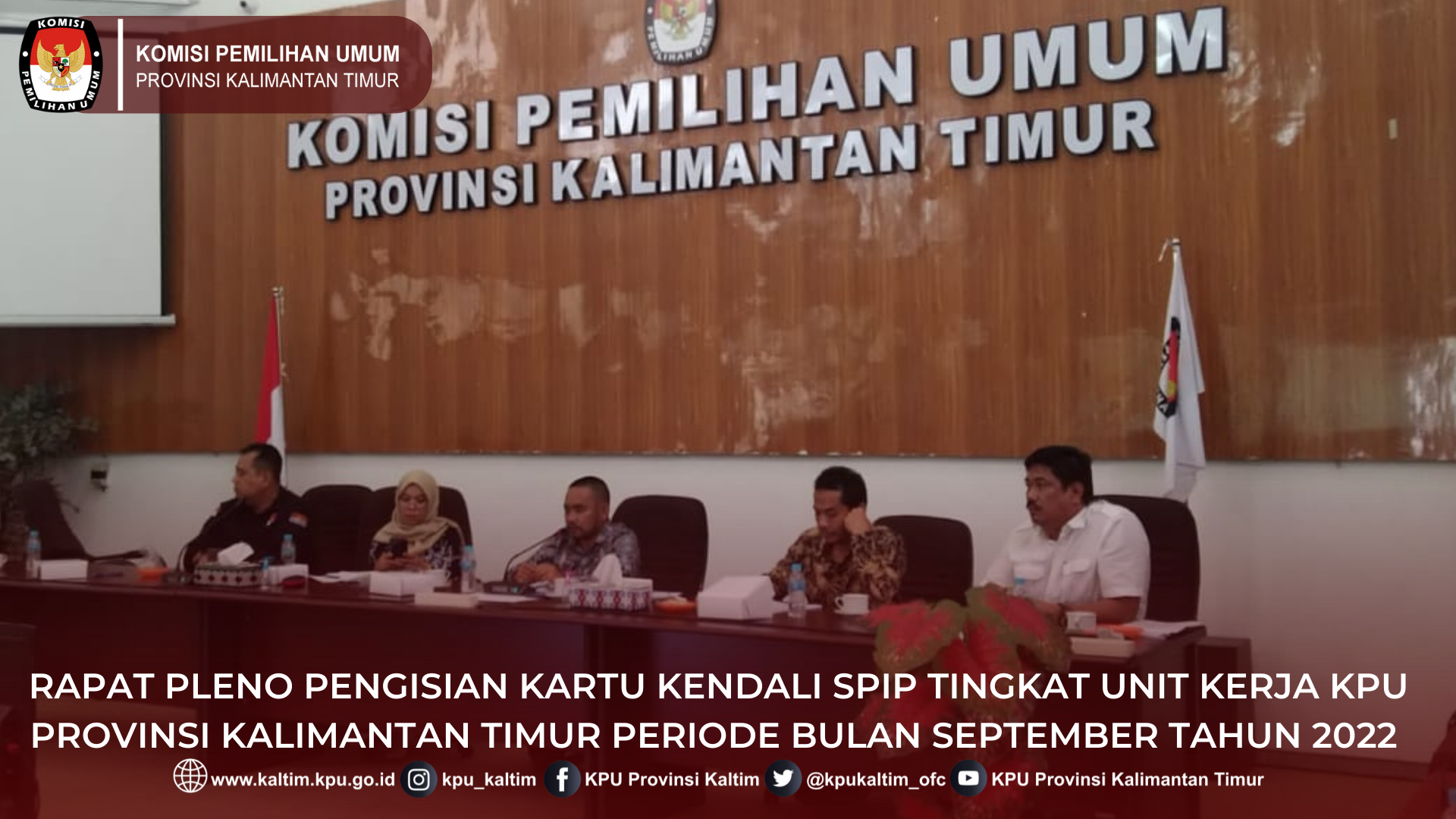 Samarinda, kaltim.kpu.go.id – KPU Provinsi Kalimantan Timur telah melaksanakan Rapat Pleno Pengisian Kartu Kendali Pertanggungjawaban SPIP Tingkat Unit Kerja Periode Bulan September Tahun 2022 di Aula KPU Provinsi Kalimantan Timur dengan dihadiri oleh Ketua dan Anggota Komisioner, Sekretaris serta pejabat Struktural/Fungsional dengan dipimpin oleh Ketua KPU Provinsi Kalimantan Timur Bapak Rudiansyah (06/10/2022). (Tim Medsos KPU Kaltim)