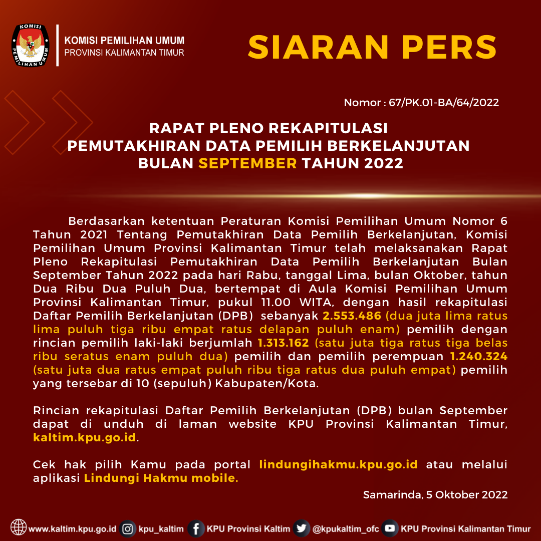 Samarinda, kaltim.kpu.go.id – Berdasarkan hasil Rapat Pleno (Rabu, 5/10/2022) rekapitulasi Data Pemilih Berkelanjutan (DPB) bulan September tahun 2022 tingkat KPU Provinsi Kalimantan Timur adalah sejumlah 2.553.486 pemilih dengan rincian pemilih laki-laki sebanyak 1.313.162 pemilih dan pemilih perempuan sebanyak 1.240.324 pemilih yang tersebar di 10 kabupaten/kota, 105 kecamatan, dan 1.038 desa/kelurahan.