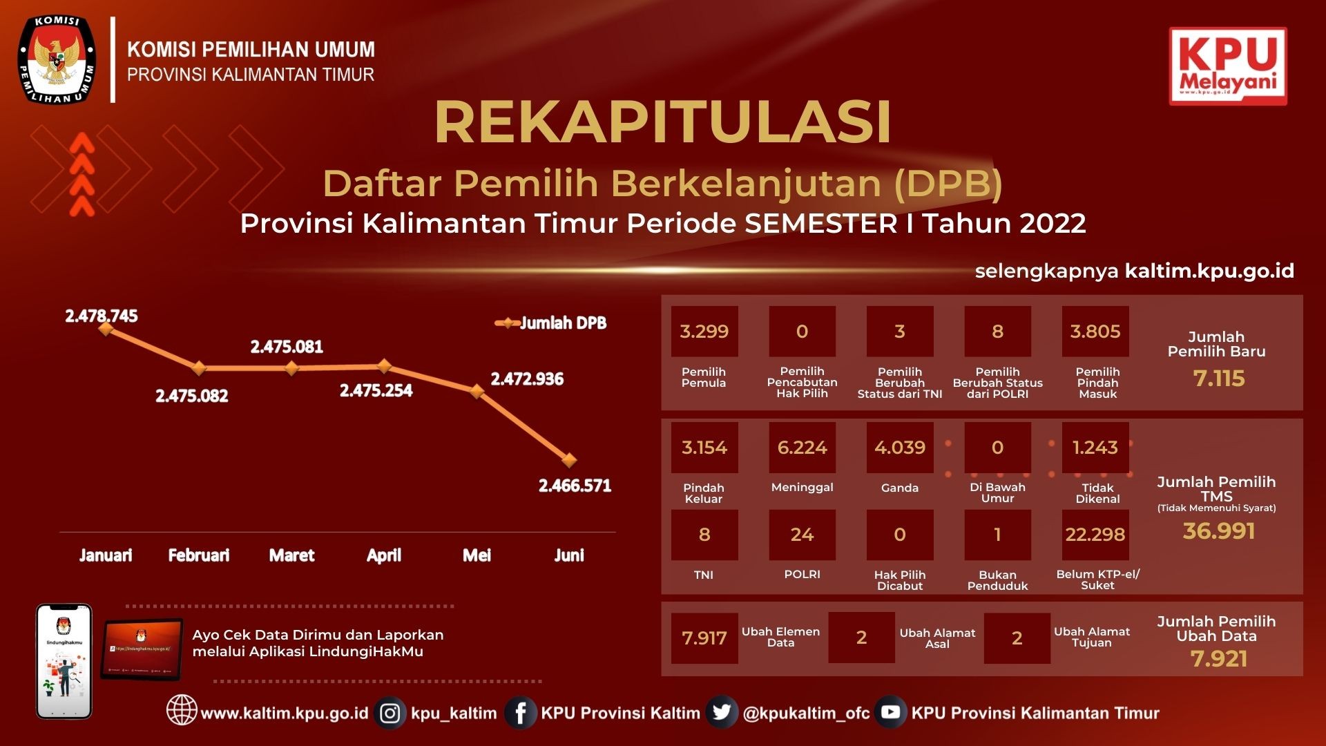 Rekapitulasi Daftar Pemilih Berkelanjutan (DPB) setiap bulannya fluktuatif mengalami perubahan dimana dari bulan Januari mengalami penurunan jumlah pemilih hingga bulan Maret namun mengalami kenaikan pada bulan April dan mengalami penurunan kembali dari bulan April sampai dengan Juni. Berikut link untuk mengunduh Berita Acara hasil Rapat Pleno Rekapitulasi Pemutakhiran Daftar Pemilih Berkelanjutan Periode Semester I Tahun 2022 Tingkat KPU Provinsi Kalimantan Timur beserta lampiran formulir Model A.2-DPB :
