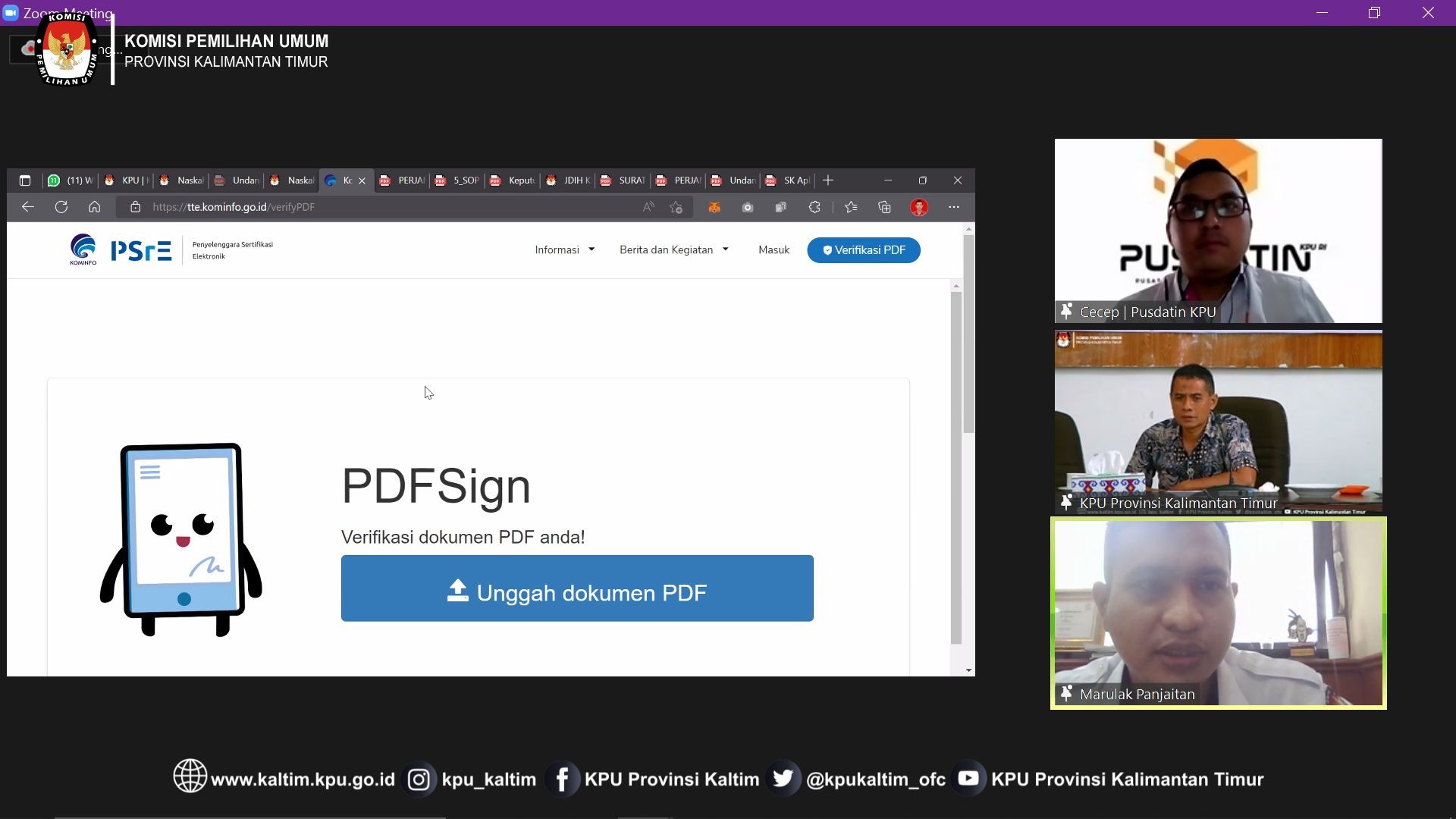 Hadir sebagai narasumber dari Pusdatin KPU RI, Cecep Husni dan Marulak Pandjaitan, menyampaikan penjelasan terkait pedoman teknis pengajuan dan penyelenggaraan Tanda Tangan Elektronik (TTE) di lingkungan KPU. Disampaikan juga pada kesempatan ini tata cara pengecekan dokumen yang telah ditanda tangani secara resmi dan bersertifikat. Tiap-tiap dokumen yang telah ditanda tangani bersertifikat resmi memiliki kriptografi yang berbeda satu sama lainnya. Ke depannya KPU akan menerapkan Tanda Tangan Elektronik (TTE) di semua jenjang dari mulai KPU RI, KPU Provinsi hingga KPU Kabupaten/Kota. (Tim Medsos KPU Kaltim)