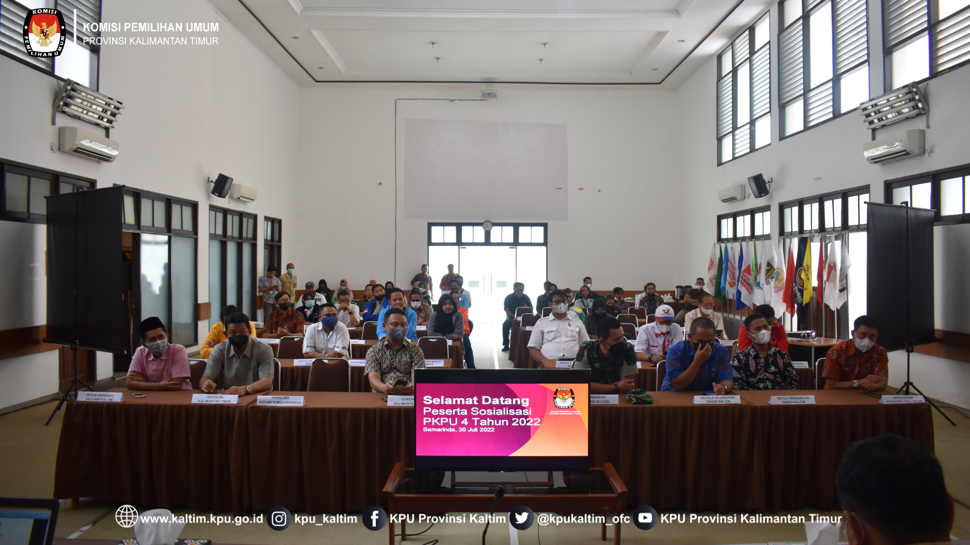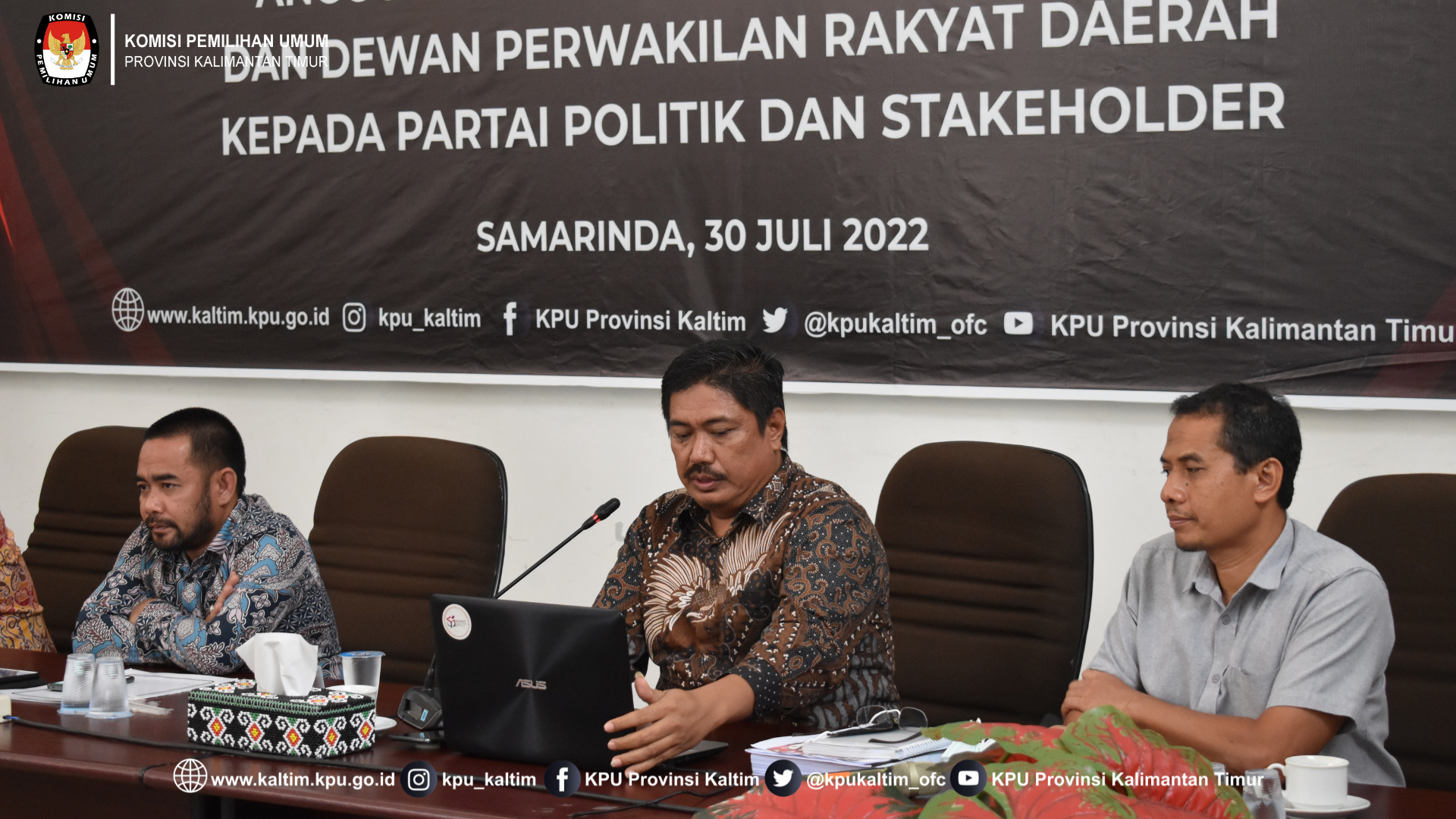 Samarinda, kaltim.kpu.go.id - KPU Provinsi Kalimantan Timur melaksanakan Sosialisasi PKPU Nomor 4 Tahun 2022 Kepada Partai Politik dan Stakeholder sekaligus pengenalan aplikasi Sistem Informasi Partai Politik (SIPOL), Sabtu (30/7/2022).