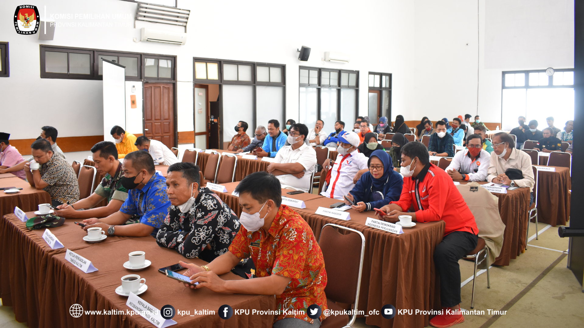 Sebagai narasumber dalam kegiatan tersebut adalah Suardi, Anggota KPU Provinsi Kalimantan Timur Divisi Teknis Penyelenggaraan), dan Iffa Rosita, Anggota KPU Provinsi Kalimantan Timur Divisi Perencanaan, Data dan Informasi. Acara dibuka oleh Ketua KPU Provinsi Kalimantan Timur, Rudiansyah. Undangan yang hadir di antaranya pimpinan Partai Politik tingkat provinsi, unsur Forkopinda Provinsi Kalimantan Timur, Kodam VI/Mulawarman, Korem 091/ASN, Polda Kaltim, Kejaksaan Tinggi Kaltim, Pegadilan Tinggi Kaltim, Bawaslu Kaltim, Kesbangpol Provinsi Kalimantan Timur.