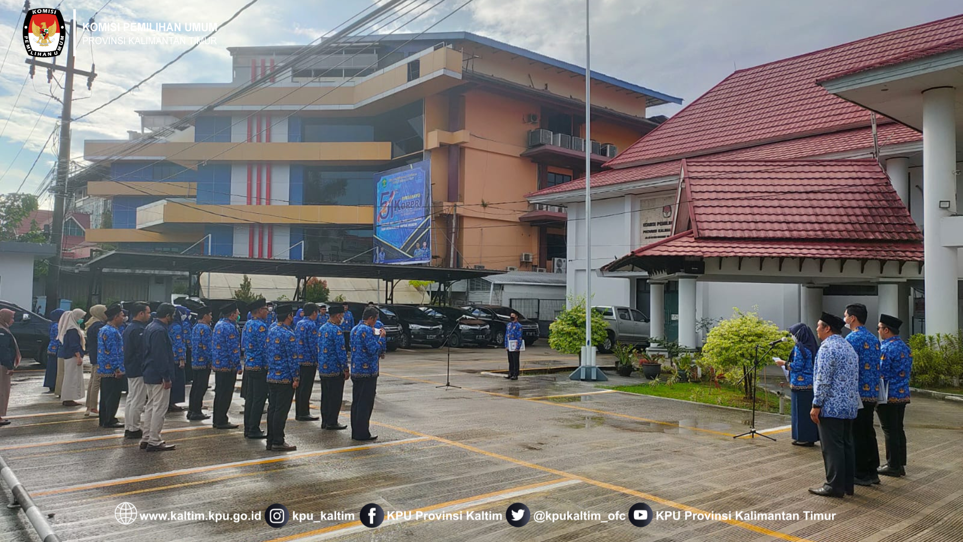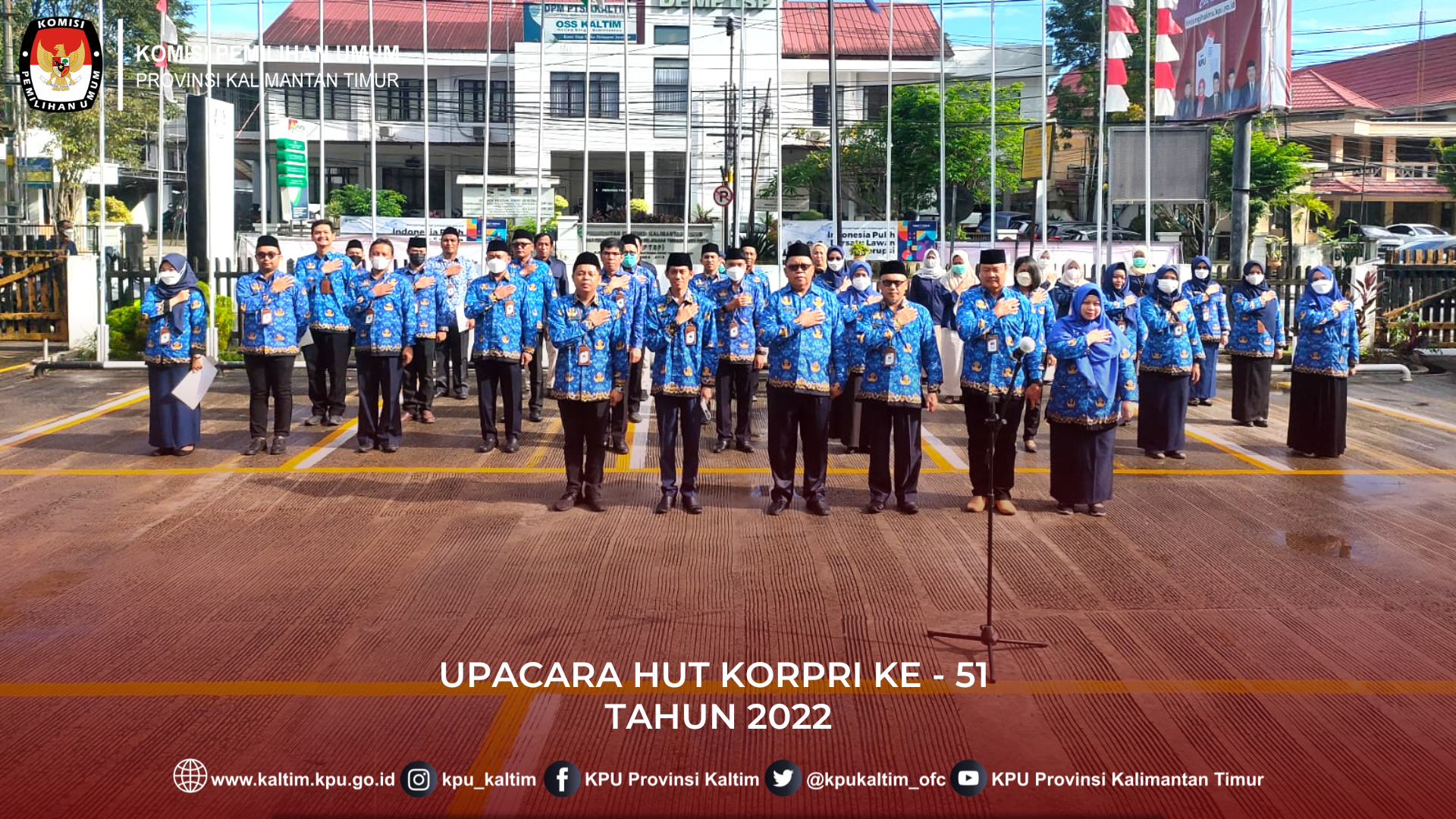 Samarinda, kaltim.kpu.go.id - Komisi Pemilihan Umum Provinsi Kalimantan Timur melaksanakan Upacara HUT Korps Pegawai Republik Indonesia (KORPRI) ke 51 dengan tema “KORPRI Melayani, Berkontribusi dan Berinovasi untuk Negeri” di halaman Kantor KPU Provinsi Kalimantan Timur, Selasa (29/11/2022).