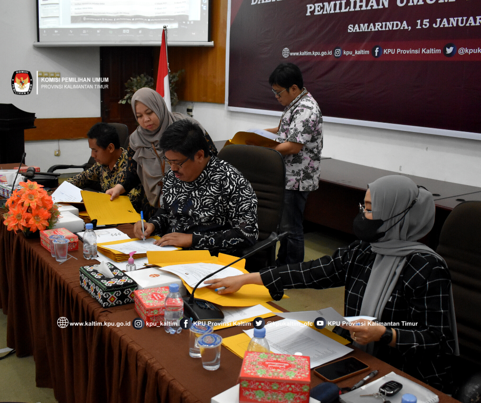 Samarinda, kaltim.kpu.go.id - KPU Provinsi Kalimantan Timur melaksanakan rapat pleno rekapitulasi hasil verifikasi administrasi dukungan bakal calon Anggota DPD daerah pemilihan Provinsi Kalimantan Timur pada pemilihan umum tahun 2024, (15/1/2023) di Aula KPU Provinsi Kalimantan Timur. Kegiatan yang dilaksanakan secara luring dan daring dipimpin Mukhasan Ajib ketua Divisi Sosdiklih Parmas dan SDM menggantikan ketua KPU Kaltim Rudiansyah yang berhalangan hadir. Acara dipandu ketua Divisi Teknis penyelenggaraan Pemilu, Suardi didampingi Iffa Rosita ketua Divisi Program Data dan Informasi serta dihadiri Sekretaris dan pejabat Struktural KPU Provinsi Kalimantan Timur, mengikuti secara daring 10 KPU kabupaten kota se Kaltim. Rapat Pleno terbuka dihadiri ketua Bawaslu Kaltim Hari Dermanto dan anggota Muhammad Ramli, Bakal Calon Anggota DPD sebagian diwakili Petugas Penghubung Bakal Calon Anggota DPD. Dalam rapat pleno dibacakan hasil verifikasi administrasi dukungan bakal calon Anggota DPD kepada 24 bakal calon anggota DPD dilanjutkan penandatanganan serta penyerahan berita acara hasil verifikasi administrasi kepada Bawaslu dan bakal calon anggota DPD. (Tim Medsos KPU Kaltim)