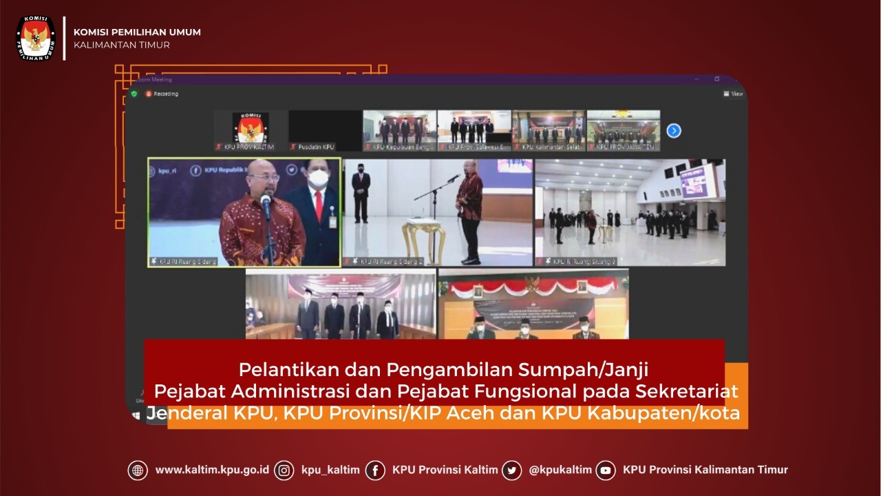 Samarinda - Rabu (05/01/2022) KPU Provinsi Kalimantan Timur mengikuti Pelantikan dan Pengambilan Sumpah/Janji Pengangkatan Jabatan Administrasi dan Jabatan Fungsional pada Sekretariat Jenderal KPU, Sekretariat KPU/KIP Provinsi dan Sekretariat KPU/KIP Kabupaten/Kota Tahun 2020 via zoom meeting.