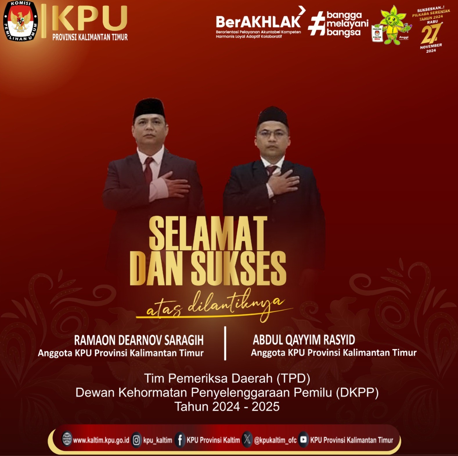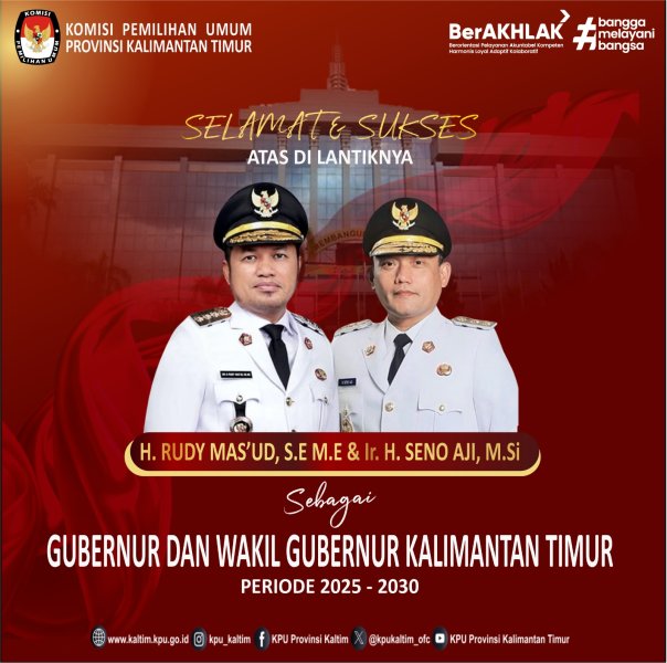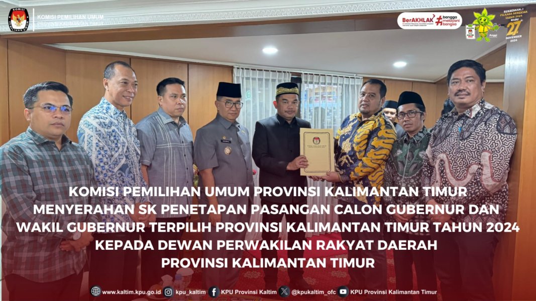 Samarinda, kaltim.kpu.go.id - Komisi Pemilihan Umum Provinsi Kalimantan Timur Menyerahkan Surat Keputusan Nomor 50 Tahun 2025 Tentang Penetapan Pasangan Calon Gubernur dan Wakil Gubernur Terpilih Provinsi Kalimantan Timur Tahun 2024 kepada Dewan Perwakilan Rakyat Daerah Provinsi Kalimantan Timur, di Kantor DPRD Provinsi Kalimantan Timur, Jumat (7/2/2025) Surat Keputusan diserahkan langsung oleh Ketua KPU Provinsi Kalimantan Timur, Fahmi Idris kepada Ketua DPRD Provinsi Kalimantan Timur, Hasanuddin Mas’ud, didampingi Anggota KPU Provinsi Kalimantan Timur, Suardi, Abdul Qayim Rasyid, dan Asmadi, Plt. Sekretaris KPU Provinsi Kalimantan Timur, Nurdiyawan, Kepala Bagian Teknis Penyelenggaraan Pemilu dan Hukum, Fandi Akhmad dan Kasubbag Teknis Penyelenggaraan Pemilu, Yulianita Adityarini. Hadir dalam kegiatan Pj. Gubernur Provinsi Kalimantan Timur, Akmal Malik, Anggota Bawaslu Provinsi Kalimantan Timur, Galeh Akbar Tanjung, Anggota DPRD Provinsi Kalimantan Timur, Muhammad Husni Fahruddin, Kegiatan merupakan tindaklanjut Peraturan Komisi Pemilihan Umum Nomor 18 Tahun 2024 Tentang Rekapitulasi Hasil Penghitungan Perolehan Suara dan Penetapan Hasil Pemilihan Gubernur dan Wakil Gubernur, Bupati dan Wakil Bupati serta Walikota dan Wakil Walikota Tahun 2024
