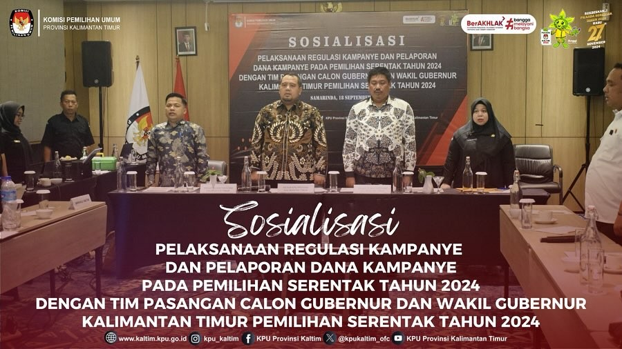 Samarinda, kaltim.kpu.go.id - 18 September 2024 KPU Provinsi Kalimantan Timur melaksanakan Sosialisasi Pelaksanaan Regulasi Kampanye dan Pelaporan Dana Kampanye Pada Pemilihan Serentak Tahun 2024 Dengan Tim Pasangan Calon Gubernur dan Wakil Gubernur Kalimantan Timur Pemilihan Serentak Tahun 2024 bertempat di Hotel Mercure Samarinda, Kegiatan Sosialisasi dibuka oleh Ketua KPU Provinsi Kalimantan Timur Fahmi Idris, dan didampingi Anggota KPU Provinsi Kalimantan Timur Suardi, Abdul Qayyim Rasyid dan jajaran Sekretariat KPU Provinsi Kalimantan Timur. Hadir pula Ketua Bawaslu Provinsi Kalimantan Timur, Perwakilan Polda Kalimantan Timur, dan Tim dari dua Pasangan Calon Gubernur dan Wakil Gubernur Kalimantan Timur.