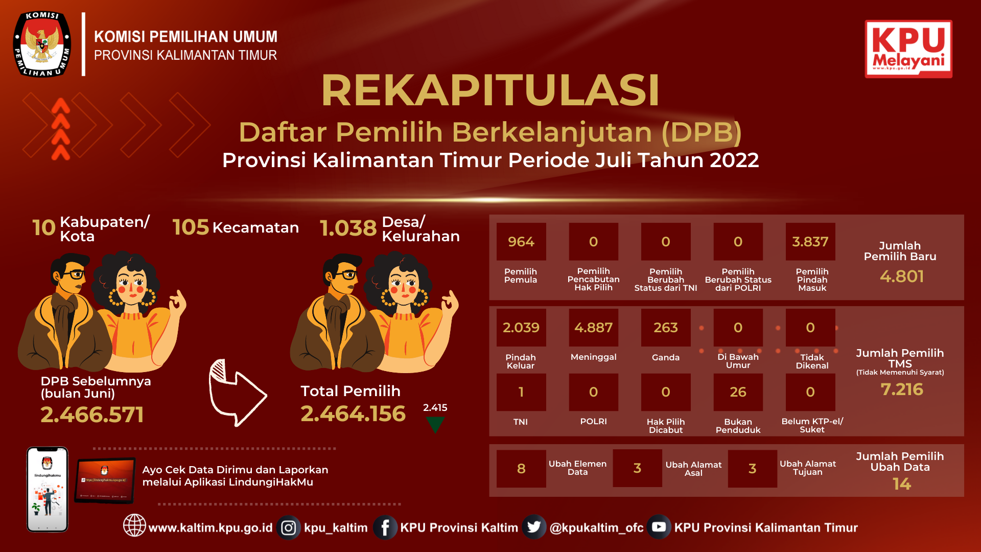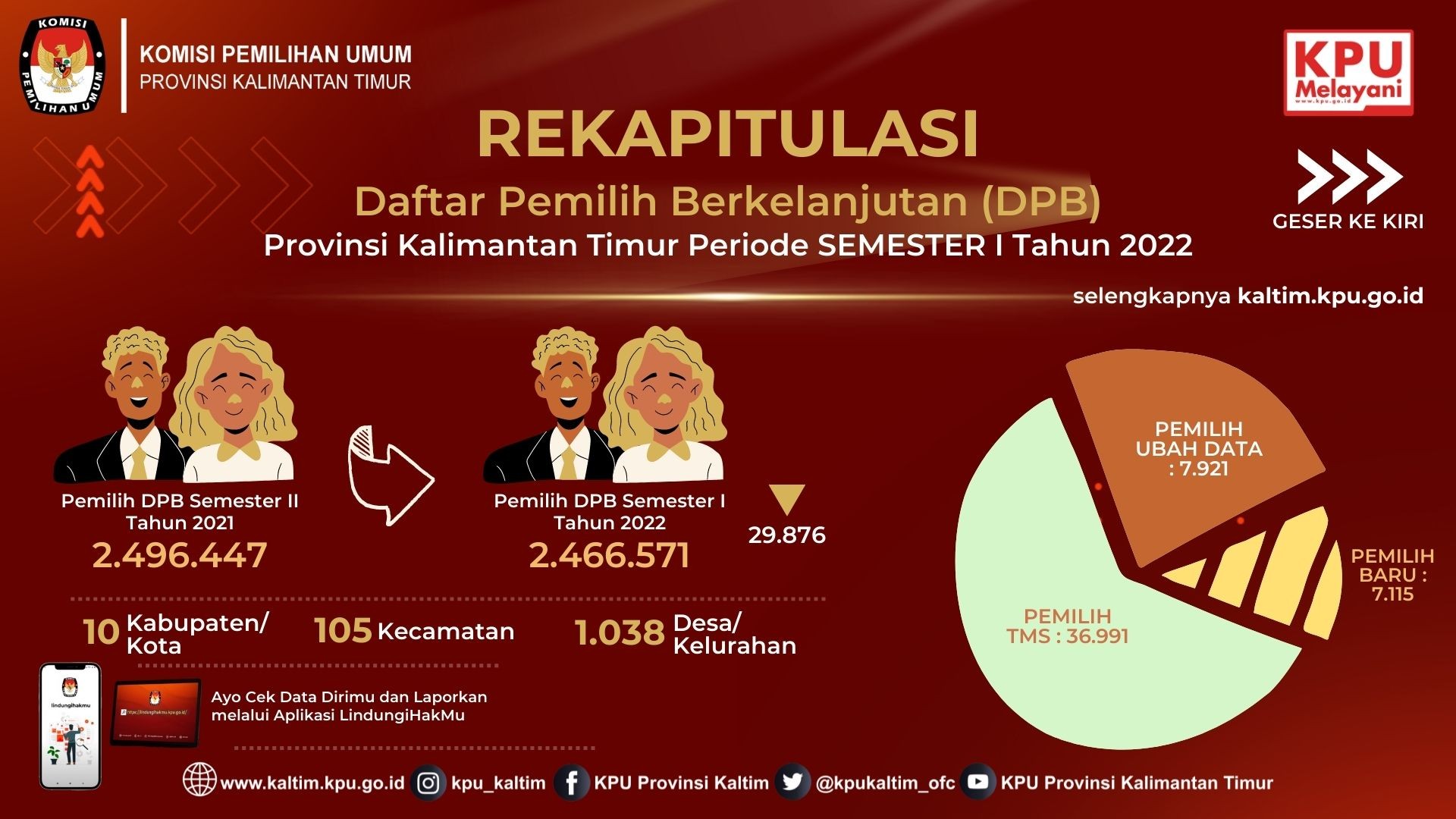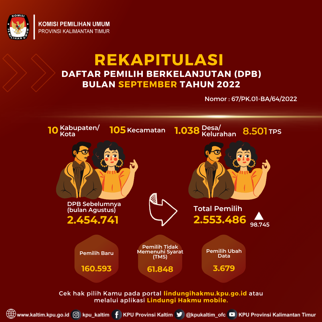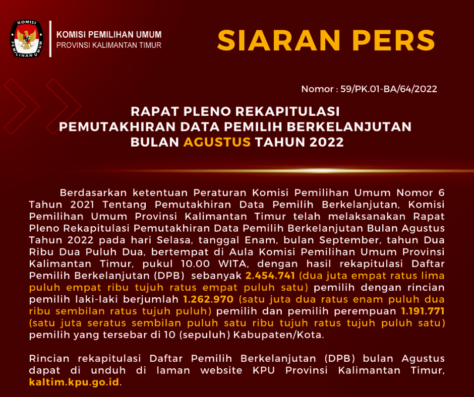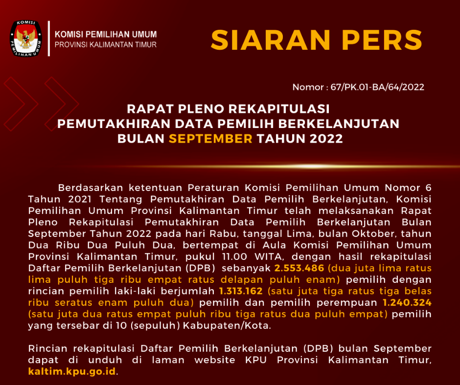 #TemanPemilih, Data Pemilih Berkelanjutan yang selanjutnya disingkat DPB adalah Data Pemilih hasil pemutakhiran dan penyusunan yang berlangsung secara terus-menerus sedangkan Pemutakhiran Data Pemilih Berkelanjutan yang selanjutnya disingkat PDPB adalah kegiatan untuk memperbaharui Data Pemilih berdasarkan Daftar Pemilih Tetap dari Pemilu atau Pemilihan terakhir dan telah disinkronisasikan dengan data kependudukan secara nasional. Pemutakhiran Data Pemilih Berkelanjutan dilaksanakan mulai tahun 2020 serentak di seluruh daerah di Indonesia. Pada tahun 2020 pelaksanaan Pemutakhiran Data Pemilih Berkelanjutan di provinsi Kalimantan Timur hanya diselenggarakan oleh KPU Kabupaten Penajam Paser Utara yang tidak melaksanakan Pemilihan Serentak Tahun 2020. Dimulai pada tahun 2021, berdasarkan Surat Ketua KPU Republik Indonesia Nomor 132/PL.02-SD/01/KPU/II/2021 tanggal 4 Februari 2021 perihal Pemutakhiran Data Pemilih Berkelanjutan Tahun 2021 maka sepuluh KPU Kabupaten/Kota Se-Kalimantan Timur melaksanakan kegiatan pemutakhiran data pemilih secara kontinyu atau berkelanjutan. Adapun berikut rekapitulasi DPB tingkat KPU Provinsi Kalimantan Timur yang dituangkan dalam Berita Acara hasil Rapat Pleno: Tahun 2020 Rekapitulasi DPB Triwulan I : Rekapitulasi DPB TW I Tahun 2020 Rekapitulasi DPB Triwulan II : Rekapitulasi DPB TW II Tahun 2020 Rekapitulasi DPB Triwulan III : Rekapitulasi DPB TW III Tahun 2020 Rekapitulasi DPB Triwulan IV : Rekapitulasi DPB TW IV Tahun 2020 Tahun 2021 Rekapitulasi DPB Bulan Maret : Rekapitulasi DPB Bulan Maret Tahun 2021 Rekapitulasi DPB Bulan April : Rekapitulasi DPB Bulan April Tahun 2021 Rekapitulasi DPB Bulan Mei : Rekapitulasi DPB Bulan Mei Tahun 2021 Rekapitulasi DPB Bulan Juni : Rekapitulasi DPB Bulan Juni Tahun 2021 Rekapitulasi DPB Semester I : Rekapitulasi DPB Semester I Tahun 2022 Rekapitulasi DPB Bulan Juli : Rekapitulasi DPB Bulan Juli Tahun 2021 Rekapitulasi DPB Bulan Agustus : Rekapitulasi DPB Bulan Agustus Tahun 2021 Rekapitulasi DPB Bulan September : Rekapitulasi DPB Bulan September Tahun 2021 Rekapitulasi DPB Bulan Oktober : Rekapitulasi DPB Bulan Oktober Tahun 2021 Rekapitulasi DPB Perbaikan Bulan Juli - Oktober : Rekapitulasi DPB Perbaikan Bulan Juli - Oktober 2021 Rekapitulasi DPB Bulan November : Rekapitulasi DPB Bulan November Tahun 2022 Rekapitulasi DPB Bulan Desember : Rekapitulasi DPB Bulan Desember 2021 Rekapitulasi DPB Semester II : Rekapitulasi DPB Semester II Tahun 2022 Tahun 2022 Rekapitulasi DPB Bulan Januari : Rekapitulasi DPB Bulan Januari Tahun 2022 Rekapitulasi DPB Bulan Februari : Rekapitulasi DPB Bulan Februari Tahun 2022 Rekapitulasi DPB Bulan Maret : Rekapitulasi DPB Bulan Maret Tahun 2022 Rekapitulasi DPB Bulan April : Rekapitulasi DPB Bulan April Tahun 2022 Rekapitulasi DPB Bulan Mei : Rekapitulasi DPB Bulan Mei Tahun 2022 Rekapitulasi DPB Bulan Juni : Rekapitulasi DPB Bulan Juni Tahun 2022 Rekapitulasi DPB Semester I : Rekapitulasi DPB Semester I Tahun 2022 Rekapitulasi DPB Bulan Juli : Rekapitulasi DPB Bulan Juli Tahun 2022 Rekapitulasi DPB Bulan Agustus : Rekapitulasi DPB Bulan Juli Tahun 2022 Rekapitulasi DPB Bulan September : Rekapitulasi DPB Bulan September Tahun 2022