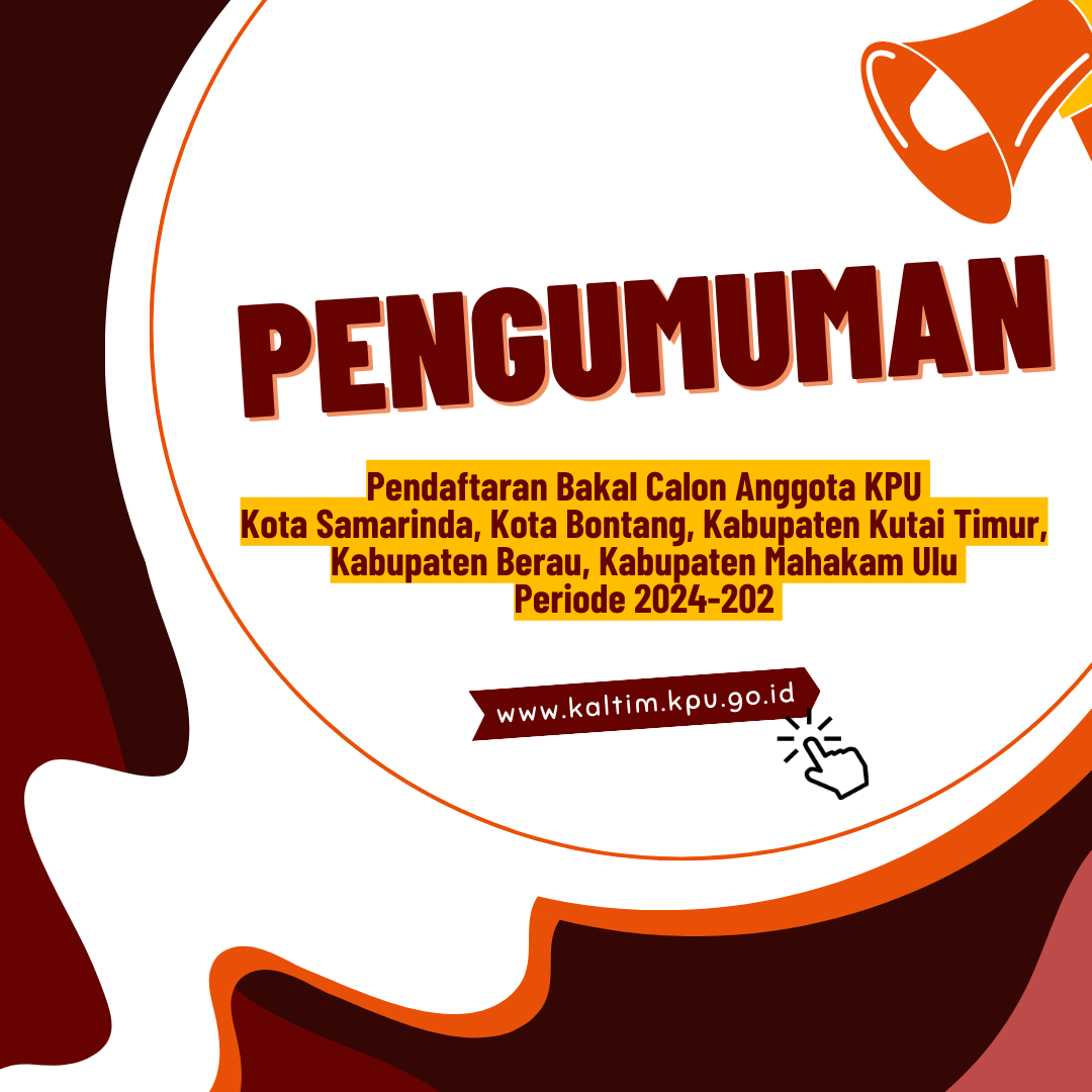 Samarinda, kaltim.kpu.go.id - Berikut kami sampaikan Pengumuman tentang Pendaftaran Bakal Calon Anggota KPU Kota Samarinda, Kota Bontang, Kabupaten Kutai Timur, Kabupaten Berau, Kabupaten Mahakam Ulu Periode 2024-2029.